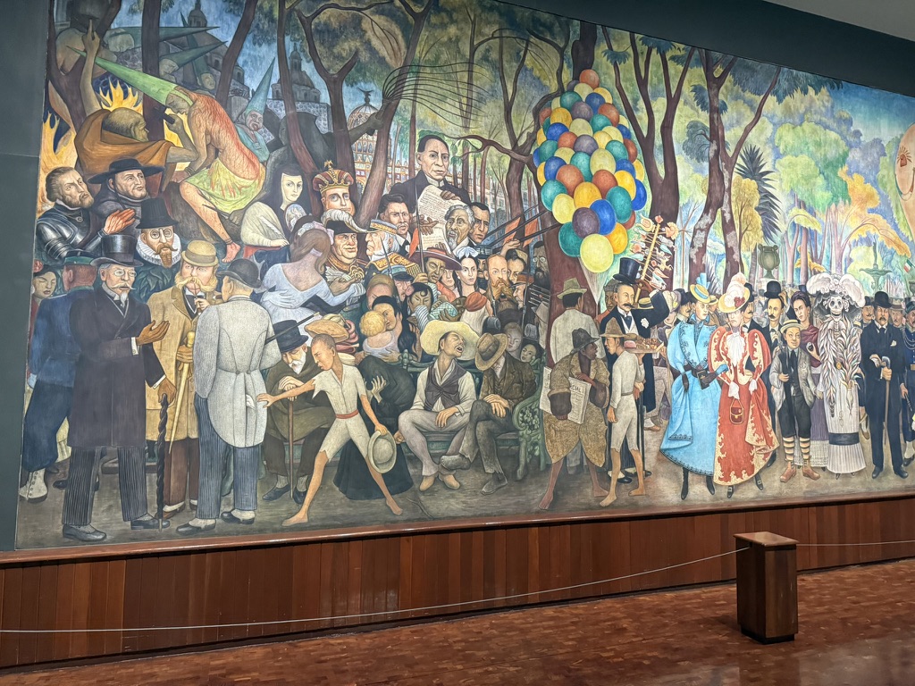 As part of Spanish class on Thursday we went to the Diego Rivera mural museum in Centro which houses his massive “Sueño de una tarde dominical en la Alameda Central.” It depicts the story of Mexico from the time of the Spanish Conquista all the way up to the 1950s. It reminded me of Thomas Hart Benton’s big triumphant murals about the American West.