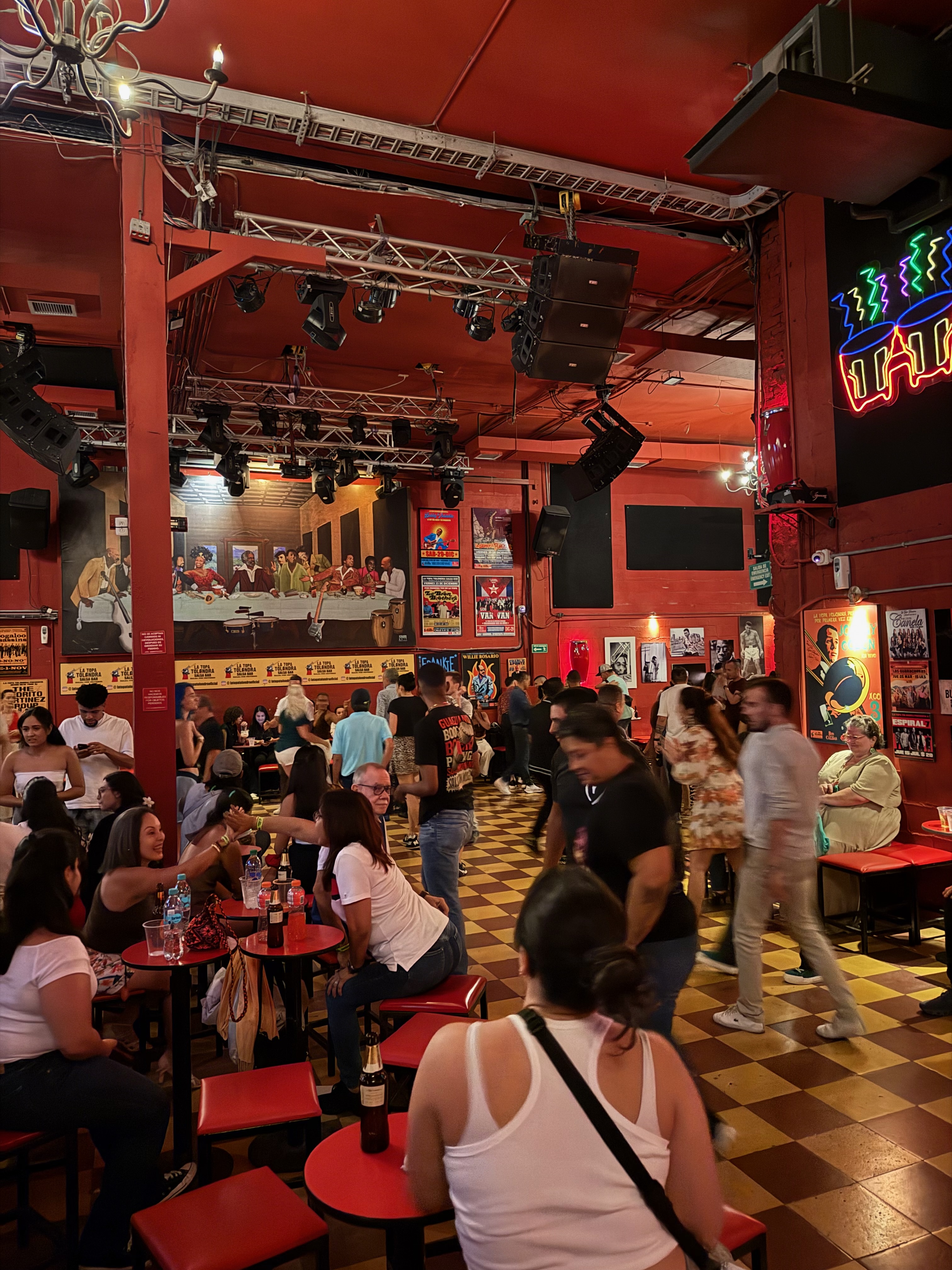 Eric, Mathis, and I visited Topa Tolondra on Sunday night, the cathedral of Salsa in Cali. It looks like a 1970s roller disco meets a 1950s high school gym. The floor is checkered, the walls are painted red and covered in murals of happy dancers and photos of past parties.